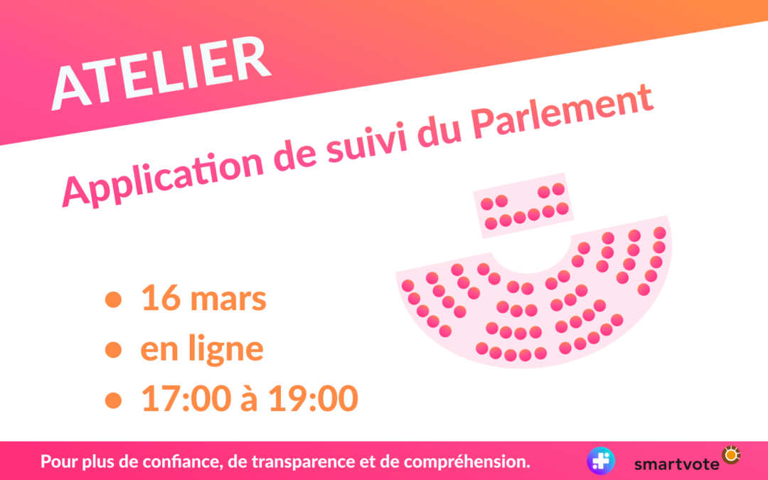 Im öffentlichen, französischsprachigen Workshop analysieren wir die Chancen und Risiken, den Wählerinnen und Wählern eine App zur Verfügung zu stellen, die ihnen hilft, die Ereignisse im Parlament zu beobachten. Wie könnte eine App zur Beobachtung des Parlaments aussehen, die das Ziel hat, das Vertrauen der Wählerinnen und Wähler in das Parlament zu stärken und gleichzeitig Politikerinnen und Politiker vor gezielten Schikanen zu schützen?