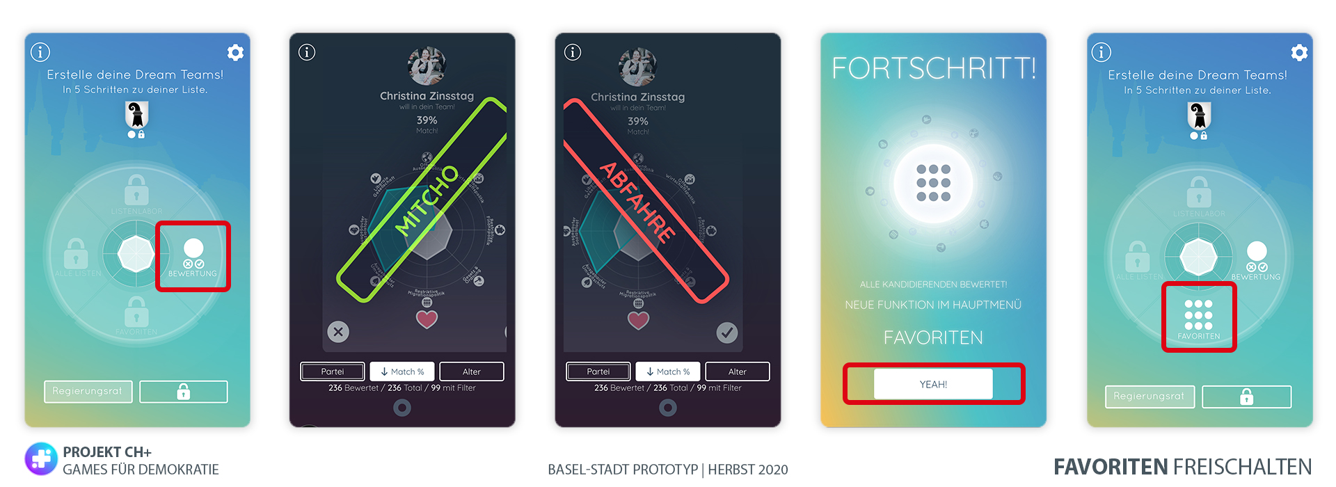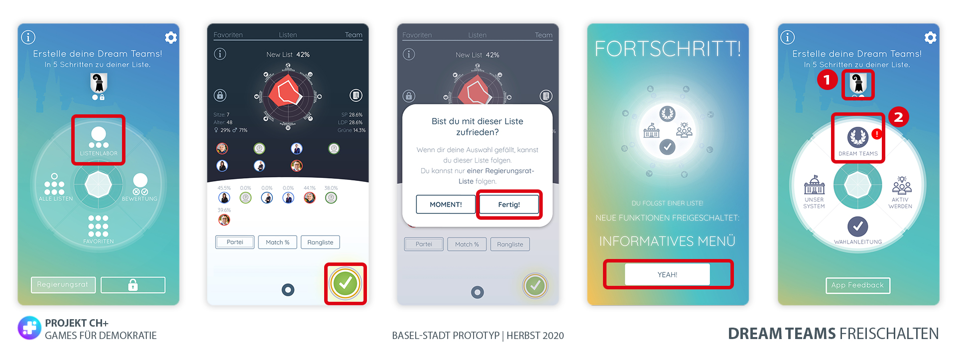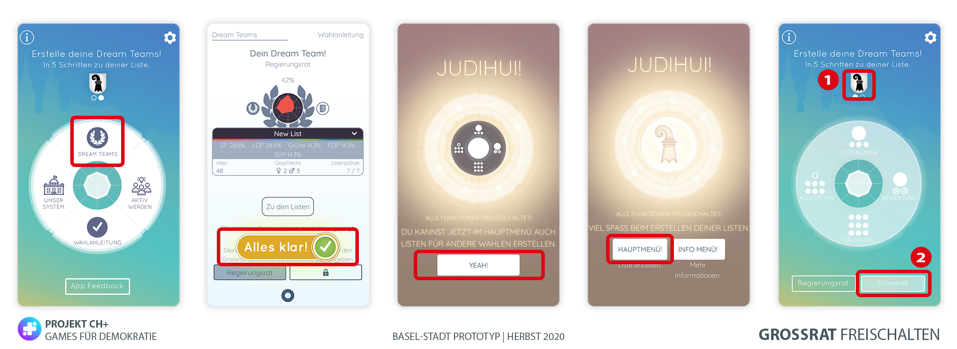In der „Dream Team“-Ansicht siehst du die Listen, welche du als Dream Teams markiert hast. Um den Grossrat freizuschalten musst du den „Alles klar!“ Knopf betätigen. Im Hauptmenü kannst du jetzt mit den Knöpfen unten am Bildschirm zwischen dem Grossrat und dem Regierungsrat wechseln.