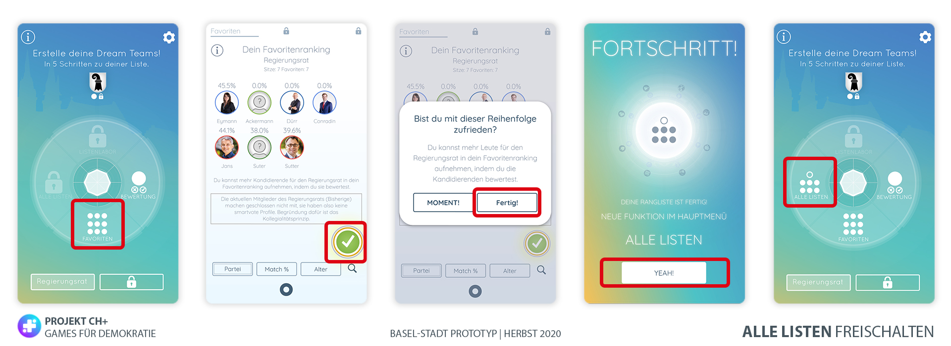 Im „Listenlabor“ kannst du deine Auswahl für den Regierungsrat (und später deine Liste für den Grossrat) via Drag & Drop zusammenstellen. Deine Liste musst du mit dem grünen Bestätigungsknopf unten rechts im Bildschirm bestätigen. Nach der Bestätigung geht es zurück in das Hauptmenü.