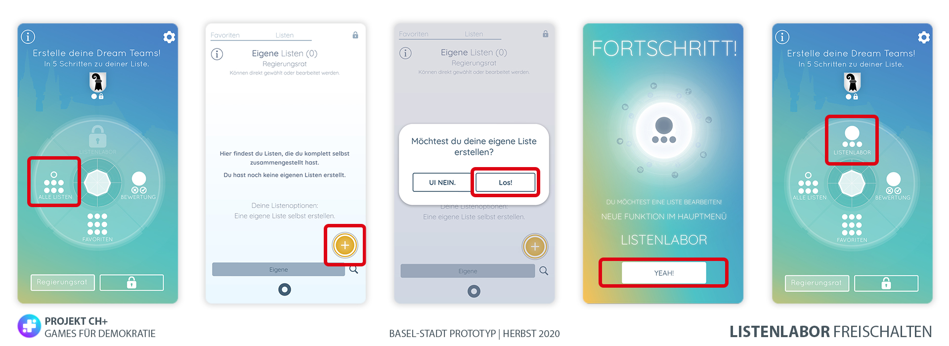 Mit dem Plus-Knopf unten rechts im Bildschirm kannst du deine eigene Liste erstellen. Sobald du bestätigst, dass du eine Liste für den Regierungsrat erstellen möchtest, wird die nächste Funktion „Listenlabor“ oben im Hauptmenü freigeschaltet.